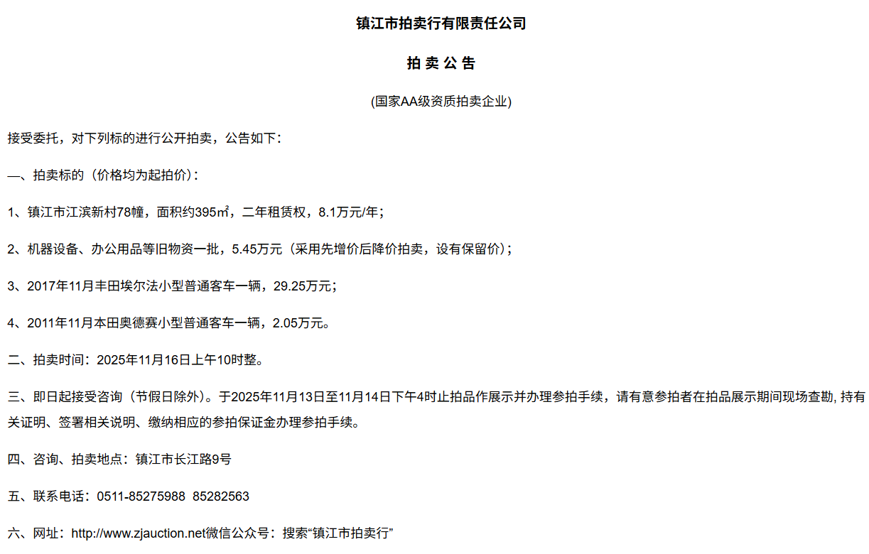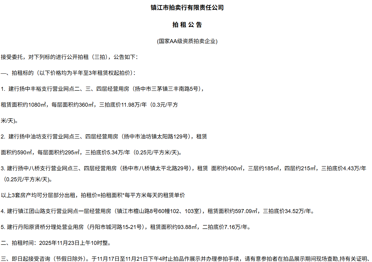 鎮江市拍賣行有限責任公司拍 租 公 吿(國家AA級資質拍賣企業)接受委托,對下列標的進行公開拍租(三拍),公告如下:—、拍租標的(以下價格均為半年至3年租賃權起拍價):1.  建行揚中豐裕支行營業網點二、三、四層經營用房(揚中市三茅鎮三豐南路5號),租賃面積約1080㎡,每層面積約360㎡,三拍底價11.98萬/年(0.3元/平方米/天)。2.  建行揚中油坊支行營業網點三、四層經營用房(揚中市油坊鎮太陽路129號),租賃面積約590㎡,每層面積約295㎡,三拍底價5.34萬/年(0.25元/平方米/天)。3. 建行揚中八橋支行營業網點三、四層經營用房(揚中市八橋鎮太平北路29號),租賃  面積約400㎡,三層約185㎡,四層約215㎡,三拍底價4.43萬/年(0.25元/平方米/天)。以上3套房產均可分層部分出租,拍租價=拍租面積*每平方米每天的租賃單價4. 建行鎮江團山路支行營業網點一層經營用房(鎮江市檀山路8號60幢102、103室),租賃面積約597.09㎡,三拍底價34.52萬/年。5. 建行丹陽原賢橋分理處營業用房(丹陽市城河路15-21號),租賃面積約93.88㎡,二拍底價7.16萬/年。二、拍租時間:2025年11月23日上午10時整。三、即日起接受咨詢(節假日除外)。于11月17日至11月21日下午4時止拍品作展示并辦理參拍手續,請有意參拍者在拍品展示期間現場查勘,持有關證明、簽署相關說明、繳納相應的參拍保證金辦理參拍手續。四、咨詢、拍租地點:鎮江市長江路9號五、聯系方式:0511-85275988   13655299933楊先生六、網址:http://www_zjauction_net.gy3a.com;微信公眾號:搜索“鎮江市拍賣行” 拍品清單2025.11.23序號名稱起拍價(元)標的說明1建行揚中豐裕支行營業網點二、三、四層經營用房(揚中市三茅鎮三豐南路5號),租賃面積約1080㎡,每層面積約360㎡三拍底價11.98萬/年(0.3元/平方米/天)1、1-3號房產均可分層部分出租,拍租價=拍租面積*每平方米每天的租賃單價;2、意向競拍人在拍賣前需持營業執照或身份證與委托方說明租賃房產經營業態,確定意向后出具房產承租用途承諾書,經委托方審核后,方可交納保證金參加競拍;3、租賃期限為半年至3年(承租方與出租方協商而定),承租方每半年或一年結付租金,租賃期間的水、電費用及其它相關費用均由承租方承擔;4、承租方不得用于經營和保管危險物品,不得用于開設餐飲、娛樂等可能嚴重影響消防安全、運營安全的經營業態,不得用于經營委托貸款、小額貸款等可能冒用委托方名義,帶來聲譽風險的經營業態。租賃期內,承租方不得破壞墻體結構,自行成就消防、安全等使用條件,不得擅自將租賃房屋轉租、轉讓給他人使用,否則委托方有權收回房屋;5、拍租成交后,承租方將租金交至出租方指定賬戶,傭金交至拍賣方賬戶(拍租傭金為該房屋一個月租金)。承租方憑租賃合同無息退還保證金。2建行揚中油坊支行營業網點三、四層經營用房(揚中市油坊鎮太陽路129號),租賃面積約590㎡,每層面積約295㎡三拍底價5.34萬/年(0.25元/平方米/天)3建行揚中八橋支行營業網點三、四層經營用房(揚中市八橋鎮太平北路29號),租賃面積約490㎡,每層面積約245㎡三拍底價4.43萬/年(0.25元/平方米/天)4建行鎮江團山路支行營業網點一層經營用房(鎮江市檀山路8號60幢102、103室),建筑面積約597.09㎡三拍底價34.52萬/年5建行丹陽原賢橋分理處營業用房(丹陽市城河路15-21號),建筑面積約93.88㎡二拍底價7.16萬/年